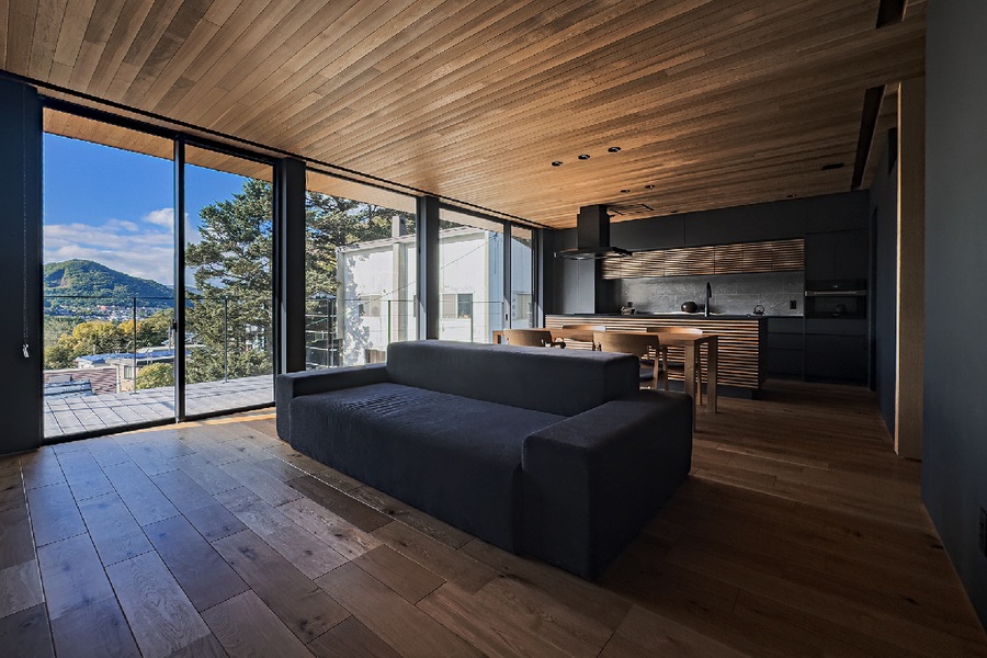 広大な窓からの山景色を通じて内部と外部の境界をあいまいにする。