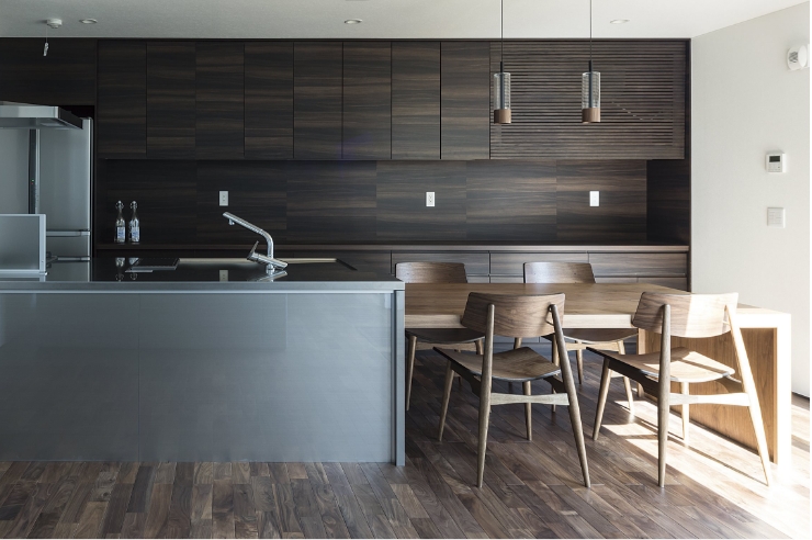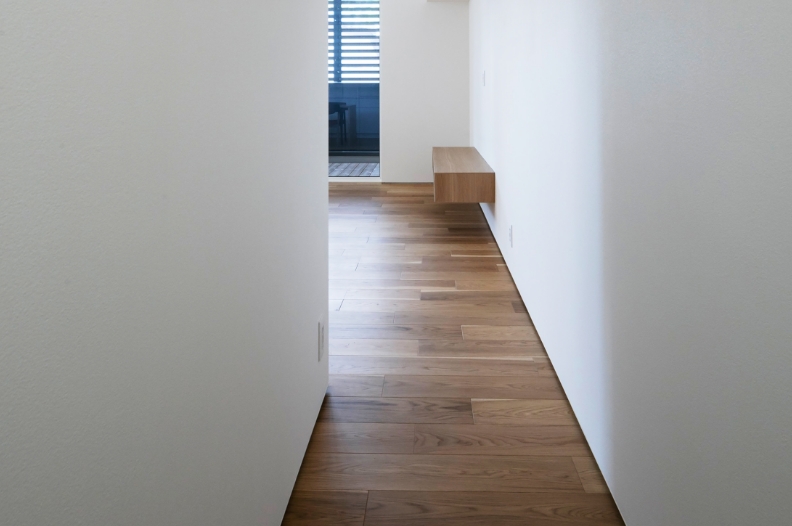 クロスや塗装では表現できない自然素材ならではの温かみのある見た目と重厚感があります。そして無垢材のもつ調湿性と香りが居心地の良い快適な空間に導いてくれます。樹種はもちろん、幅や長さといった寸法感にもこだわることで部屋全体の意匠性を上げ、経年変化による無垢材特有の色の濃淡や、一つ一つ違う木の表情を味わう楽しさを与えてくれます。