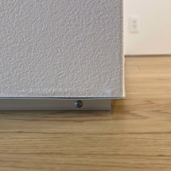 壁面から巾木が出ている出巾木ではなく,壁面よりも内側に設置するL型の入り巾木を採用することで巾木としての存在感を無くし、壁面が協調されよりすっきりとした印象を与えます。また、アルミ材であることも洗練された空間を作り出してくれる理由の一つです。一般的な巾木と比べて施工が難しいため手間が掛かりますが、細部にまでこだわることで建物全体の統一感を大切にしています。