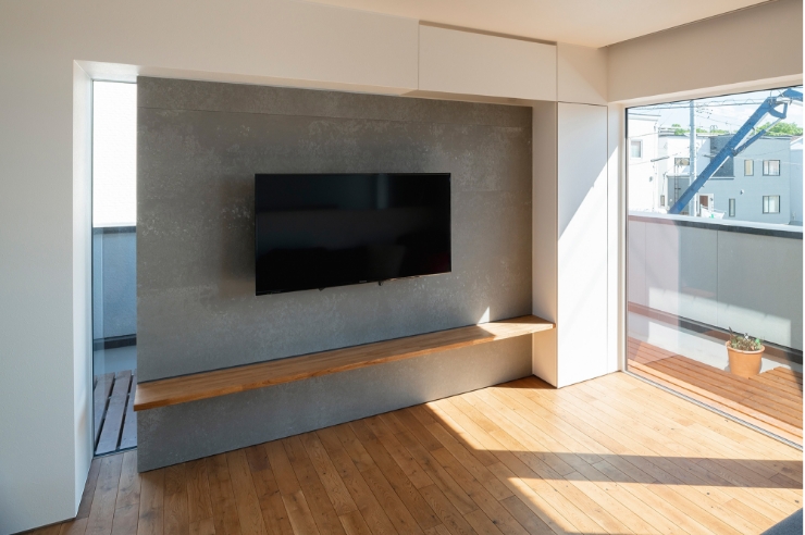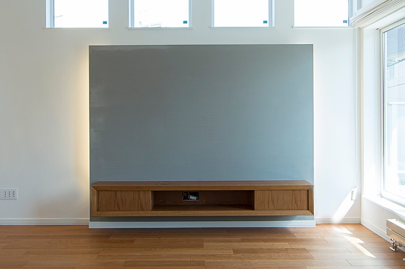 TV下にはTVボードを取り付けず、カウンター1枚のみを取り付け。トール収納の中に棚板(可動棚)を設け、機器類を収納。配線は、トール収納からTV本体を取り付ける場所まで管を通しています。