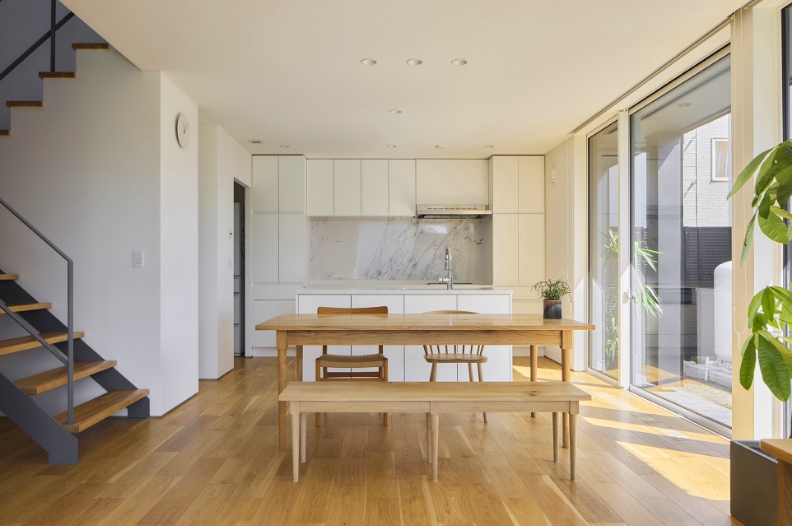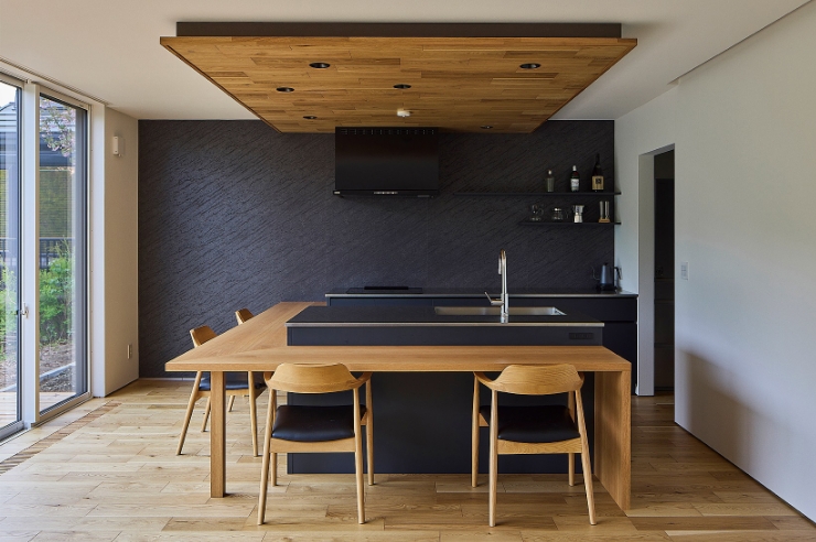 ダイニングセットを床材の樹種に合わせて制作。単独のダイニングテーブルもあれば、キッチンに固定したダイニングテーブルも制作しています。