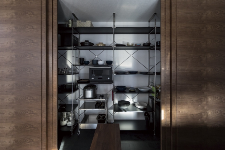 扉のみ制作し収納内は無印良品のラックを利用。造作と市販の商品を上手く組み合わせて作ることもあります。