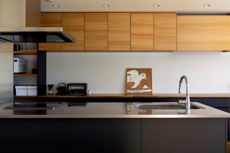 キッチンは既製品を使い、収納部分のみ造作にすることも可能です。扉の色味や取っ手の形状を合わせて、違和感のないように制作します。