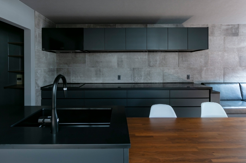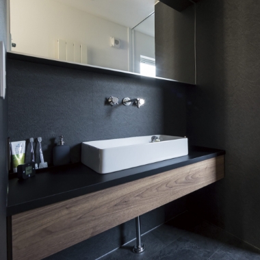 キッチンの背面や洗面化粧台の壁にも石調タイルや石材を取り入れることで耐久性は保ちながらも締まりのある上品な空間を作り出します。また、室内にはとどまらず、本来河川の護岸などに使われていたメッシュ状のかごに石を入れた蛇篭を、塀として取り入れることで程よい抜け感が出てきます。各所にちりばめられる石材や石調タイルは空間に締まりを生み出します。
