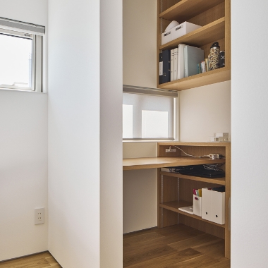 空間の印象を変えるインテリアの1つでもある室内建具。ナラ材を使用した建具は、フローリング材との調和感と木の質感を感じられ部屋の雰囲気を変えてくれます。また、ドアノブや丁番の形状など細部にまでこだわることで、建具をインテリアの一部だと再確認させてくれます。一方で、通路に面した収納の扉は、周辺の壁紙と同じもので巻き付けることで壁と馴染ませ、空間を広く感じさせてくれます。